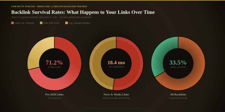 Large-scale backlink research supports this pattern. A study shows over 2.3 billion backlinks found that around 33.5% remain active overall, while 71.2% of links are eventually lost over time, with an average lifespan of about 18.4 months for news and media links.