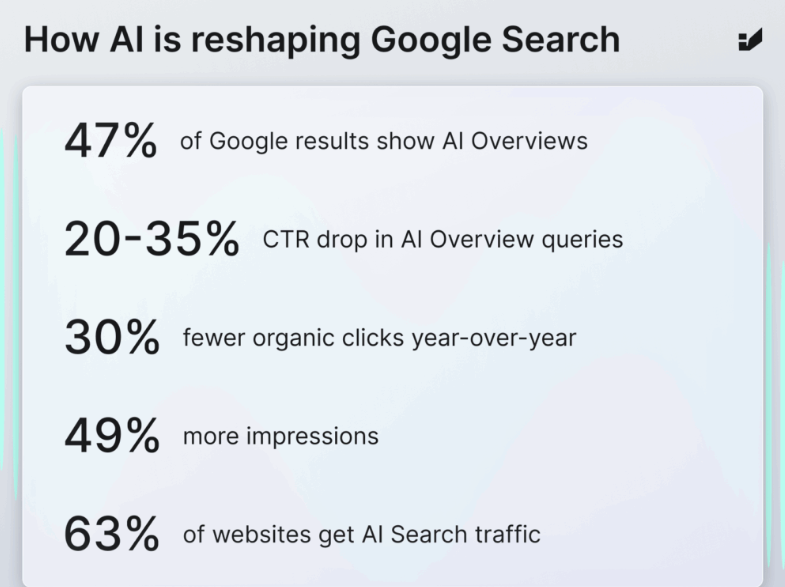 Stats show that 47% of Google search results now include some form of AI‑generated overview, which means these overviews often pull from content that’s already seen as reliable.